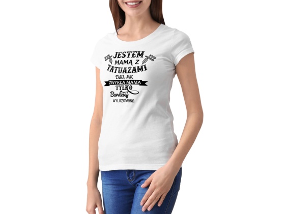 T-shirt damski "Jestem mamą z tatuażami, taka jak zwykła mama tylko bardziej wyluzowaną" to doskonały prezent dla każdej mamy, która nie boi się wyróżniać i wyrażać swojej niepowtarzalnej osobowości. Ten zabawny napis na koszulce to powiew świeżości i niekonwencjonalności w świecie codziennych obowiązków rodzicielskich.