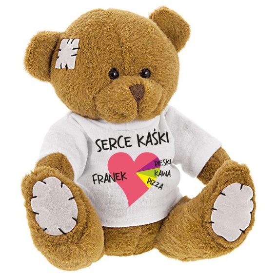 Ten miś ma koszulkę także z miejscem na personalizację. Dodaj do serca ulubione rzeczy i pasje. Na przykład, jeśli uwielbiasz sport, możesz wymienić go jako jedną z trzech rzeczy, które lubisz. Może to być siatkówka, joga lub jazda na rowerze. Możesz również wymienić inne hobby, jak na przykład malowanie lub gra na instrumencie muzycznym. Co najważniejsze dodaj swoje imię oraz imię ukochanej osoby, która zajmie najważniejsze miejsce w Twoim sercu- wykresie.